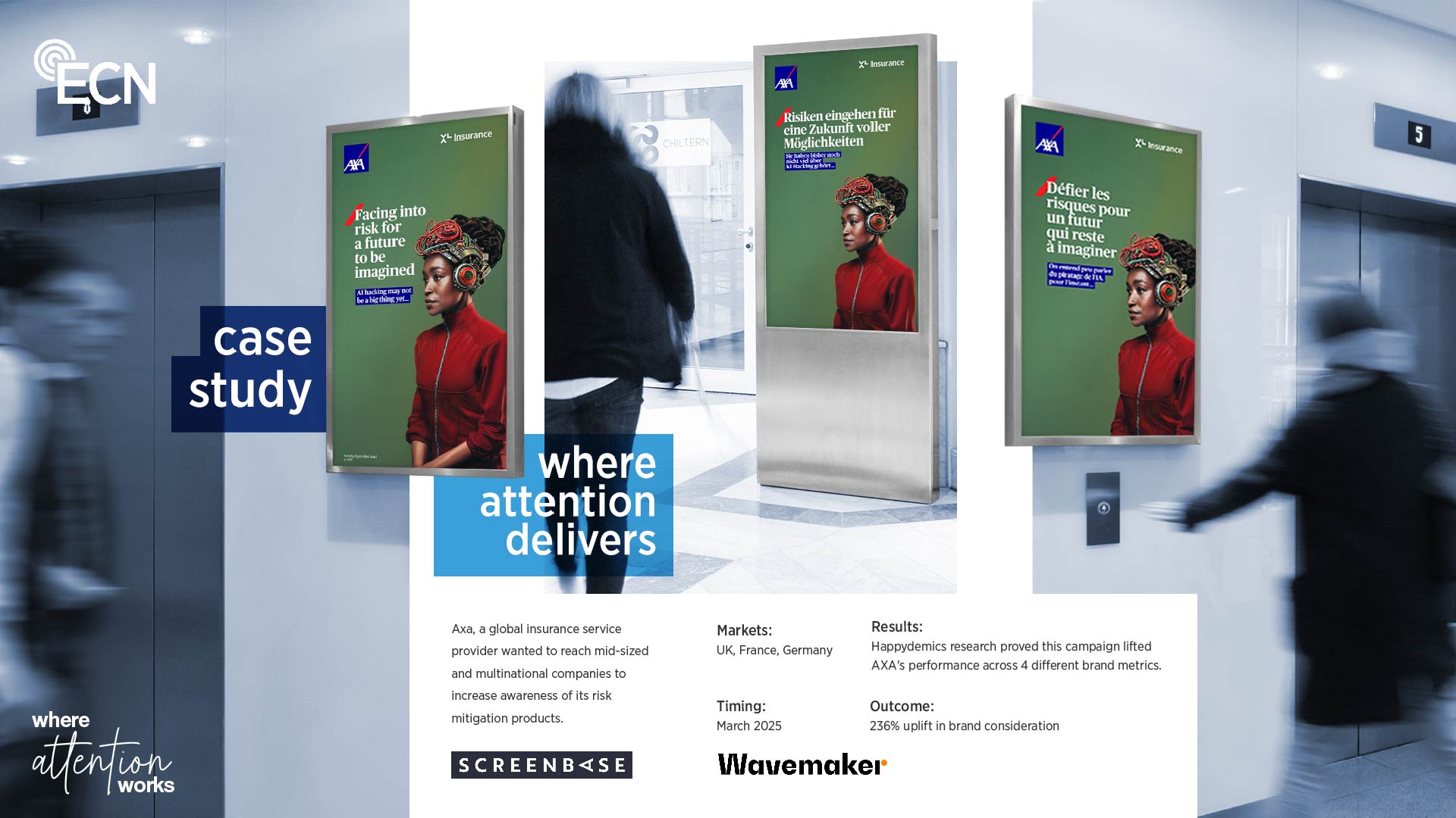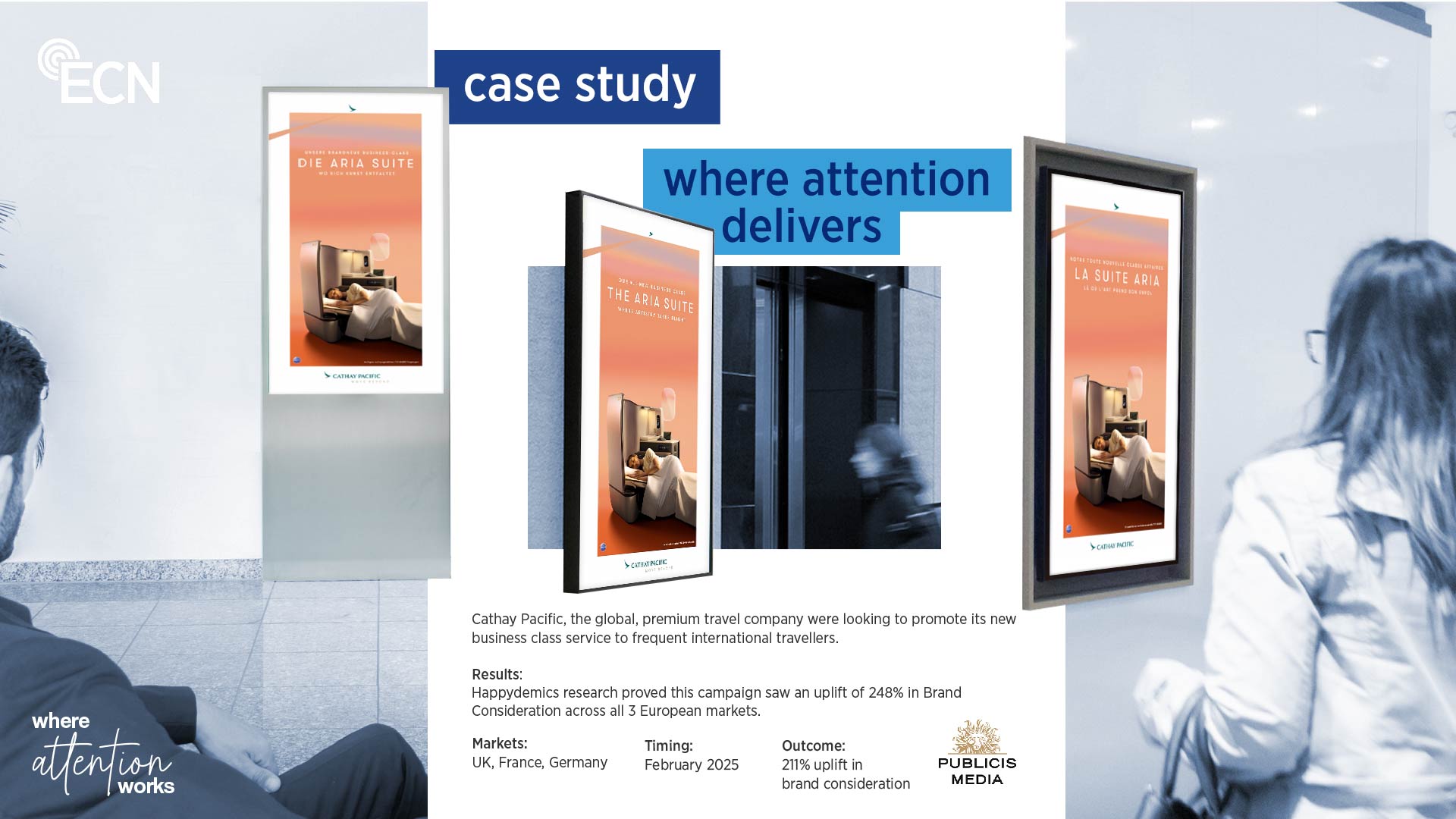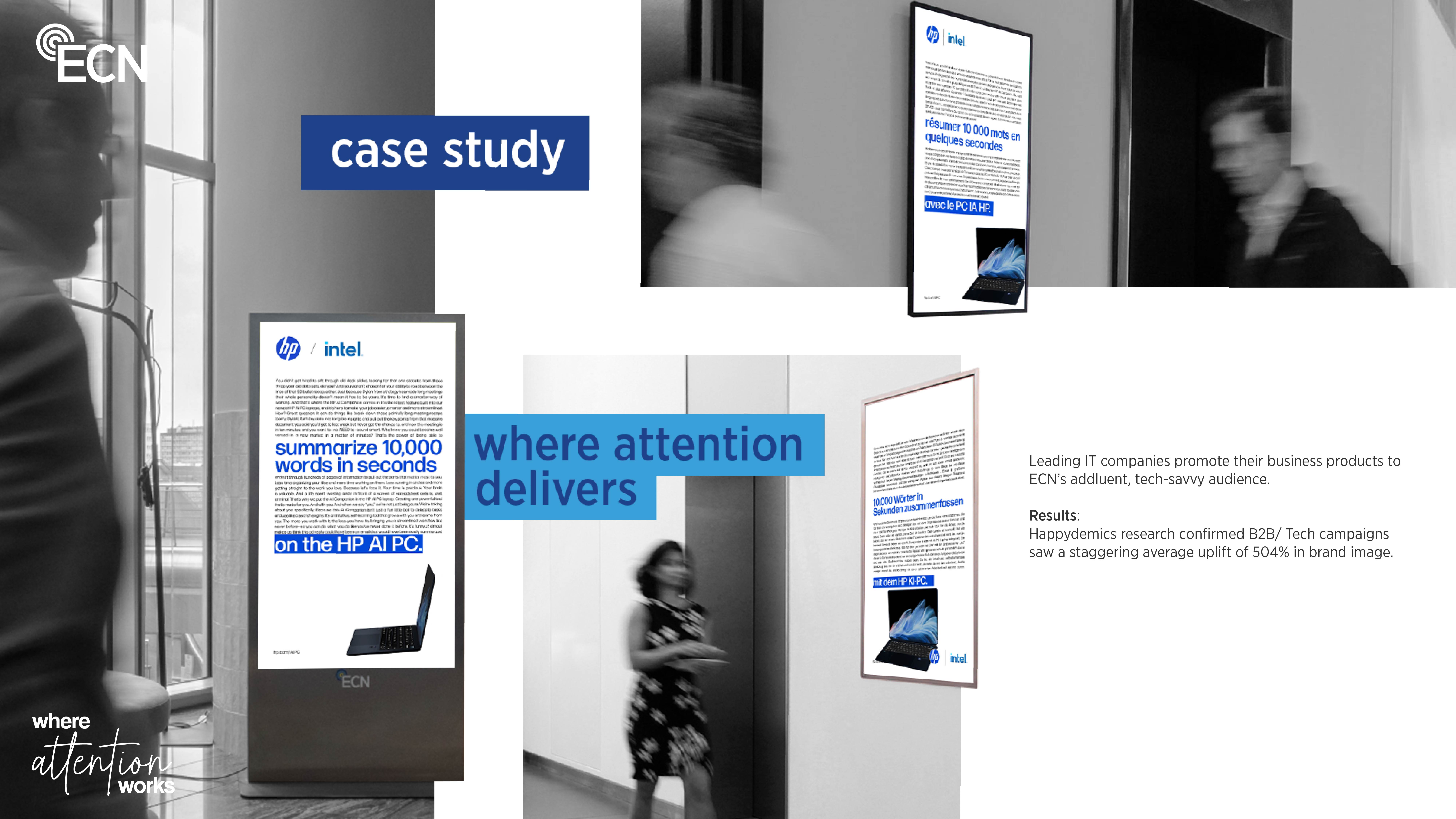 - High-attention environments – Office professionals engage with ECN screens in trusted workplace settings, delivering quality exposure.